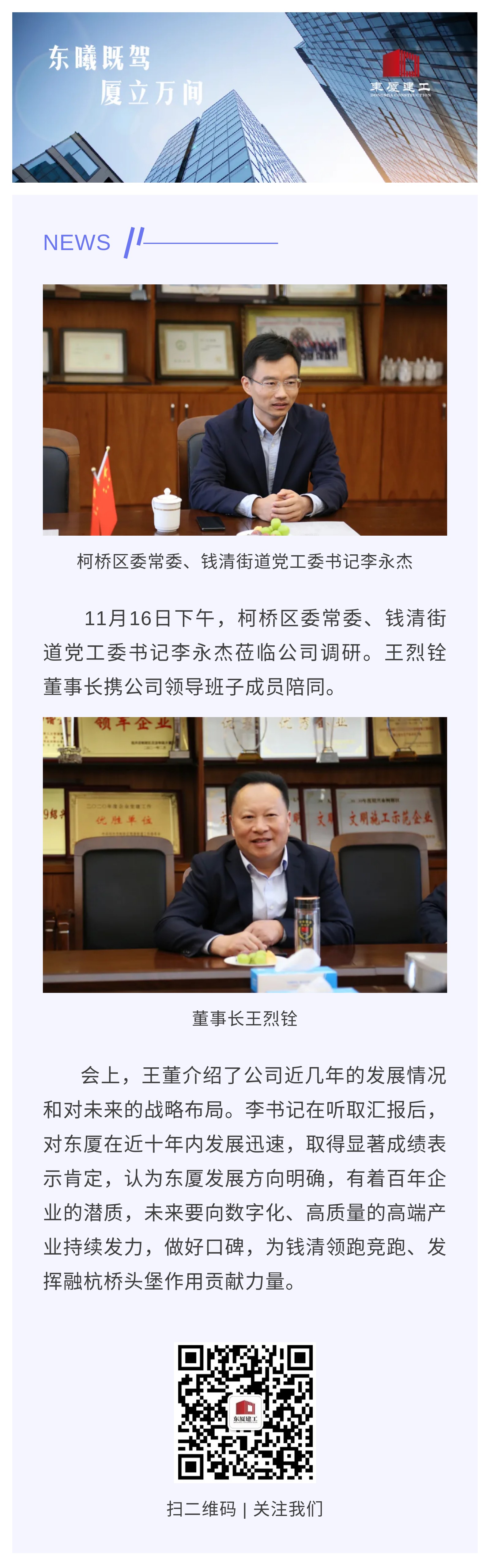 柯橋區(qū)委常委、錢清街道黨工委書記李永杰蒞臨東廈調(diào)研+