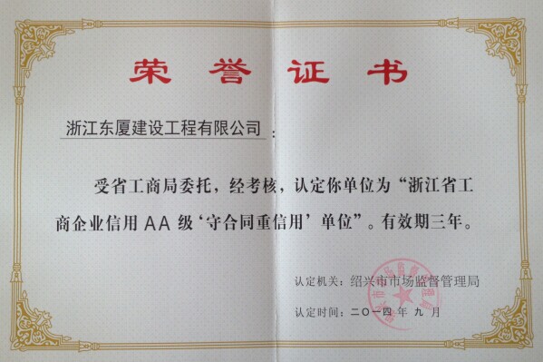 祝賀公司獲浙江省工商企業(yè)信用AA級‘守合同重信用’單位經(jīng)我公司申請,紹興市市場監(jiān)督管理局考核認(rèn)定,我單位榮獲浙江省工商企業(yè)信用AA級‘守合同重信用’單位。
