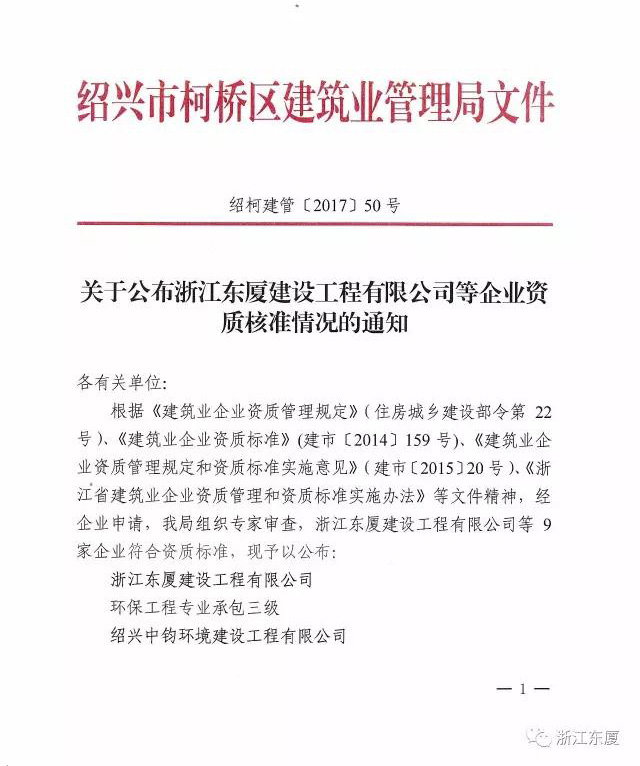 | 為進(jìn)一步提高公司綜合競(jìng)爭(zhēng)力,加強(qiáng)公司在經(jīng)營(yíng)投標(biāo)市場(chǎng)的優(yōu)勢(shì),拓展公司經(jīng)營(yíng)業(yè)務(wù)范圍。經(jīng)公司決定將承接環(huán)保工程業(yè)務(wù)作為我司拓展新領(lǐng)域,經(jīng)過前期的精心準(zhǔn)備,我司基本具備環(huán)保工程專業(yè)承包條件,近日,經(jīng)柯橋區(qū)建管局審核,我司成功取得環(huán)保工程專業(yè)承包三級(jí)資質(zhì),能承接環(huán)境工程也是公司為社會(huì)承擔(dān)的一份責(zé)任和力量。 我司在資質(zhì)管理方面將持續(xù)攀升,主動(dòng)出擊,克服困難,為公司長(zhǎng)遠(yuǎn)發(fā)展打基礎(chǔ)。