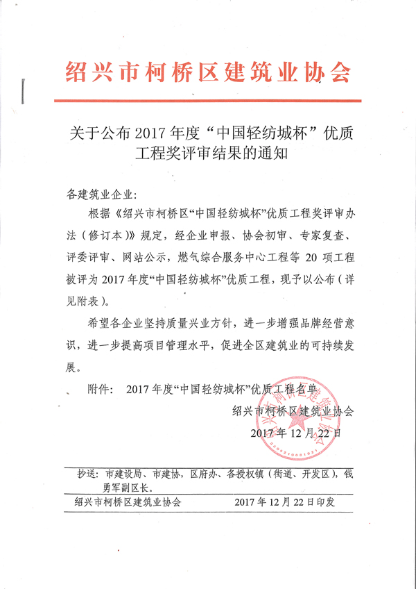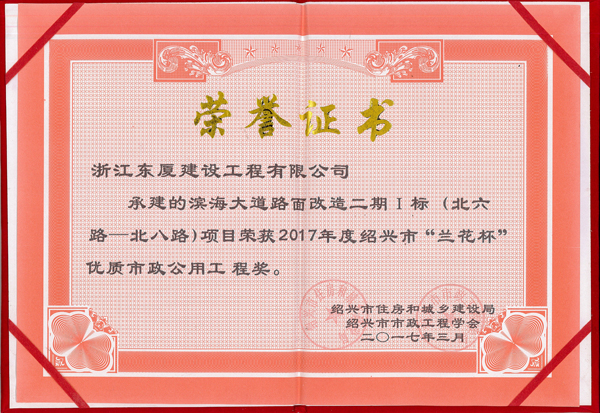| 近年來(lái),各項(xiàng)目部深入開展創(chuàng)優(yōu)奪杯工作,近日在紹興市市政工程學(xué)會(huì)2017年度會(huì)員大會(huì)上,我司首次被評(píng)為“2017年紹興市市政行業(yè)先進(jìn)單位”,承建的市政工程濱海大道路面改造二期I標(biāo)(北六路-北八路)榮獲2017年度紹興市“蘭花杯”優(yōu)質(zhì)市政公用工程獎(jiǎng)。 同時(shí),中銀國(guó)際大廈(CBD-3號(hào)地塊)工程和濱海新建北七路二項(xiàng)工程近日均被紹興市柯橋區(qū)建筑業(yè)協(xié)會(huì)評(píng)為2017年度“中國(guó)輕紡城杯”優(yōu)質(zhì)工程獎(jiǎng)。 希望各項(xiàng)目部努力發(fā)揮工匠精神,以建設(shè)精品工程為目標(biāo),互相追趕,互相學(xué)習(xí),敢做潮頭,為公司、為社會(huì)呈獻(xiàn)更多精品優(yōu)質(zhì)工程,再創(chuàng)佳績(jī)。
